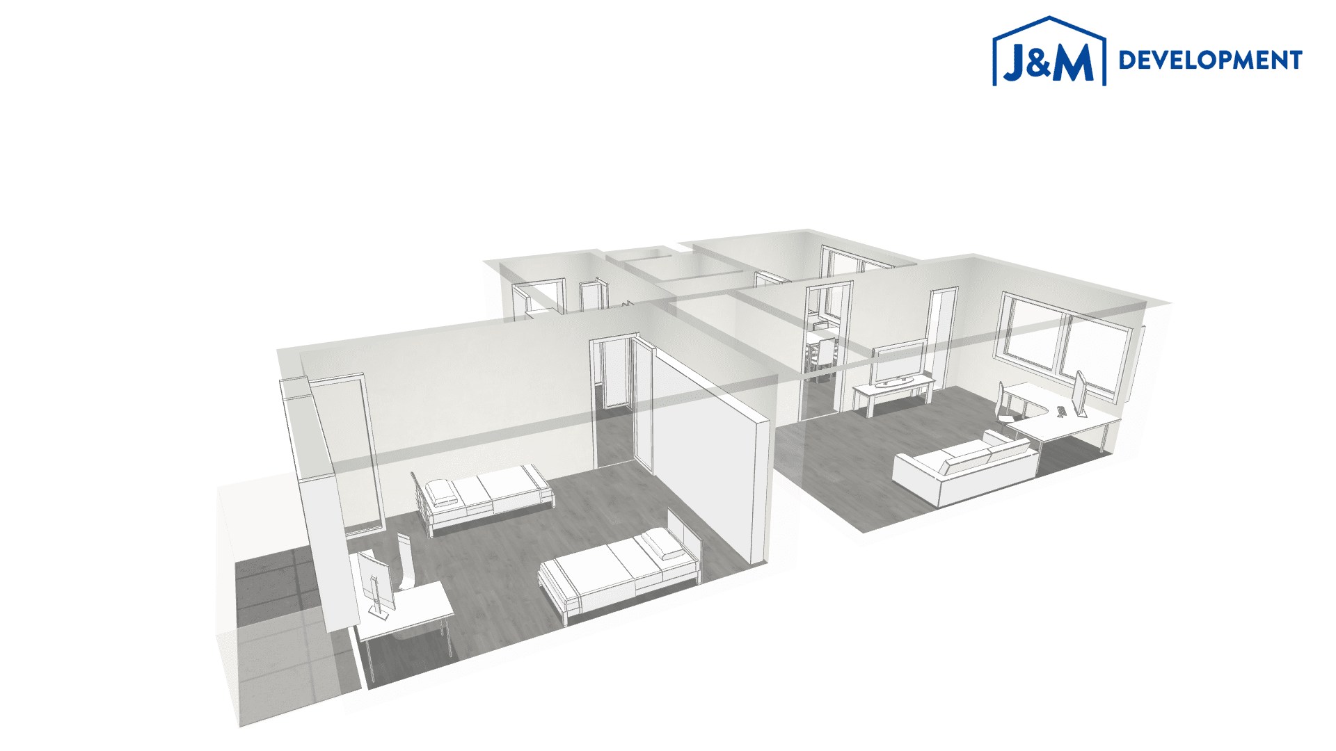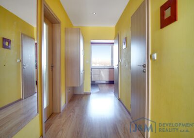 Rekonstrukce je velmi povedená a vkusná, plovoucí podlaha a interiérové dveře včetně obložek jsou v dekoru běleného dubu. Do obývacího pokoje jsou ve stejném dekoru zasunovací dveře, je tak lépe využitý prostor v předsíni. Předsíň má dvě části, ze vstupní chodby je přístup do velmi praktické komory. Z druhé části chodby je přístup do jednotlivých místností. Celý byt je světlý, prosluněný.