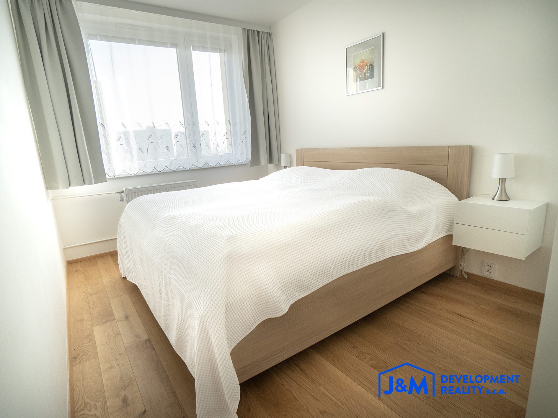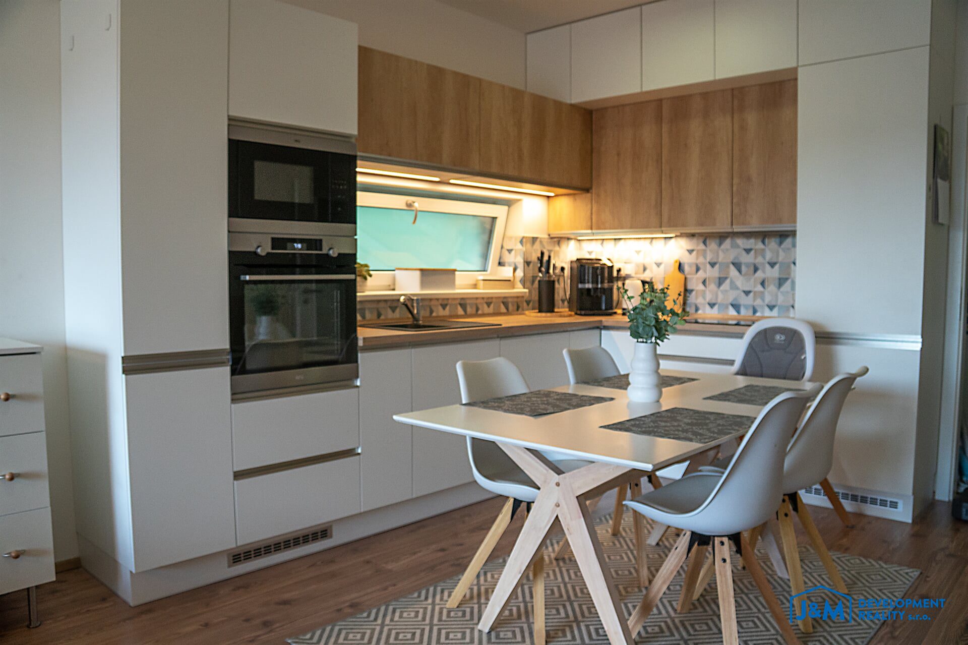 Celková výměra bytu činí 43 m² a skládá se z předsíně, obývacího pokoje, ložnice a příslušenství. Obývací pokoj je propojený s kuchyňským koutem. U oken jsou vkusně umístěny pracovní desky v dubovém dekoru, stejně jako podlaha a obložení u kuchyně. Kuchyňská linka je vybavena vestavěnými spotřebiči, včetně pračky se sušičkou, myčky a indukční desky. Digestoř má výměnné filtry a zároveň je napojená na venkovní odtah. V bytě je dřevěná podlaha, v předsíni a kuchyni praktická dlažba. Koupelna má podlahové vytápění. Na oknech jsou nainstalované žaluzie a blackout závěsy. Byt má protipožární protihlukové bezpečnostní dveře III. třídy s vložkou IV. třídy a je v něm rozveden koaxiální a datový kabel. Sklepní kóje má nové kovové dveře s klasickou vložkou FAB, přístup k ní je přes další uzamykatelné dveře a mříž. Ve sklepní kóji jsou nové policové regály včetně praktického závěsného háku na kolo a držáku na lyže.