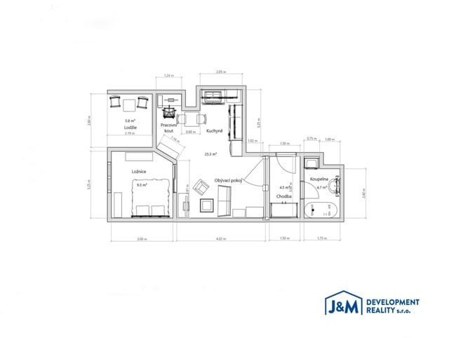 Celková výměra bytu činí 60,7 m2 + lodžie 6,5 m2, která navazuje na obývací pokoj a je orientovaná na jih. Okna jsou vybavena venkovními žaluziemi. Ložnice je na severní stranu s velmi příjemným výhledem do zeleně, klasickými žaluziemi a prostornou šatnou. Kuchyňská linka je navržená architektem na míru. Součástí chodby je praktická komora, kde je prostor pro pračku a sušičku. Byt je vybaven plovoucími podlahami. Vstupní dveře jsou bezpečnostní. K bytu náleží parkovací stání, které je umístěno v 1. podzemním podlaží domu.