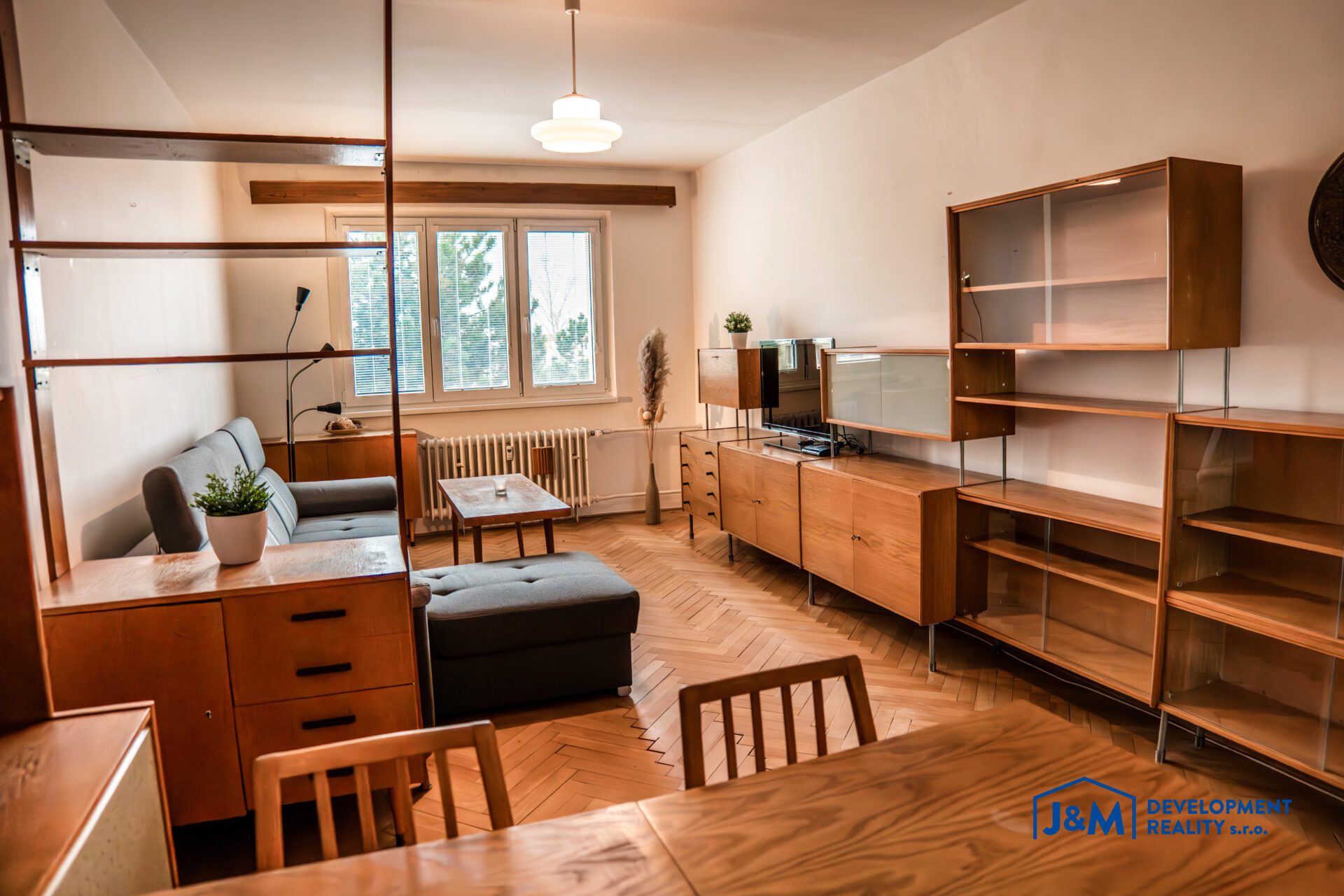 Celková výměru bytu je 55,47 m² , sklepní kóje má výměru 1,8 m². V mezipatře je možnost využívání lodžie k výlučnému užívání vlastníka nemovitosti. Byt se skládá z obývacího pokoje, který je orientován na jih s výhledem do zeleně na dětské hřiště, ložnice, kuchyně (orientace na sever), předsíně, koupelny a samostatného WC. Na oknech jsou žaluzie. Byt je ve velmi zachovalém a původním stavu, což umožňuje okamžité užívání nebo rekonstrukci dle svých představ. V ceně bytu je i nábytek, který je součástí prodeje. Po dohodě je možné nábytek odstěhovat.